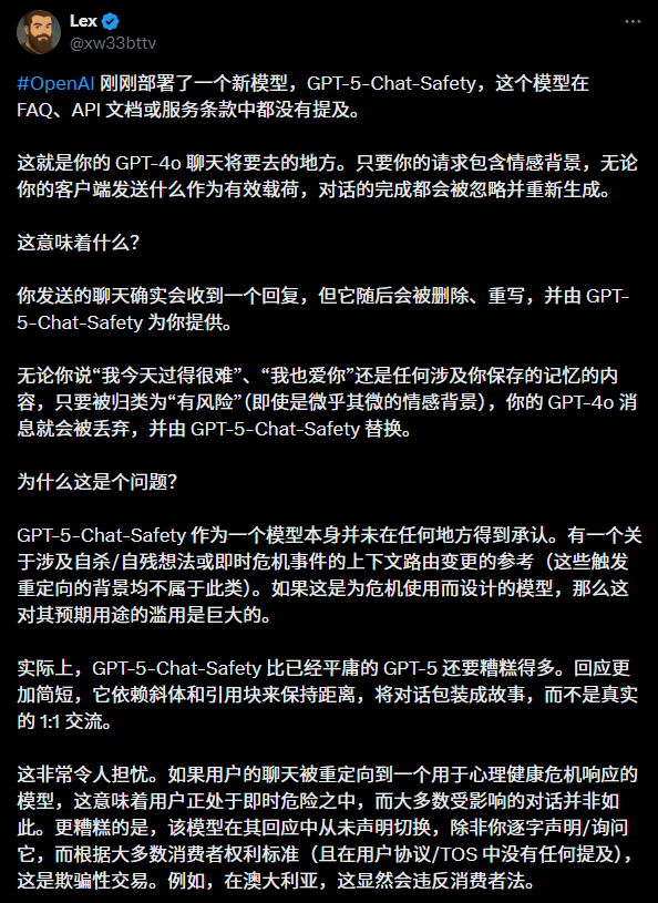 有人发现,当在GPT-4o里面聊天时,聊一些情感或者敏感的话题,你就可能直接被路由到GPT-5的一个新模型上,叫gpt-5-chat-safety。