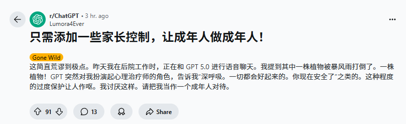 我看到Reddit上有个用户崩溃地发帖说:“我只是在和GPT聊天气,我说一株植物被暴风雨打倒了,有点难过。结果GPT突然开始扮演心理治疗师,让我深呼吸,告诉我一切都会好起来的。我他X我受够了!请把我当个成年人!”