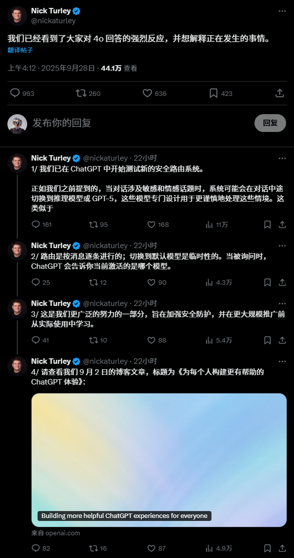 在X上被人爆出来之后,OpenAI的ChatGPT负责人出来回应,他是这么说的: