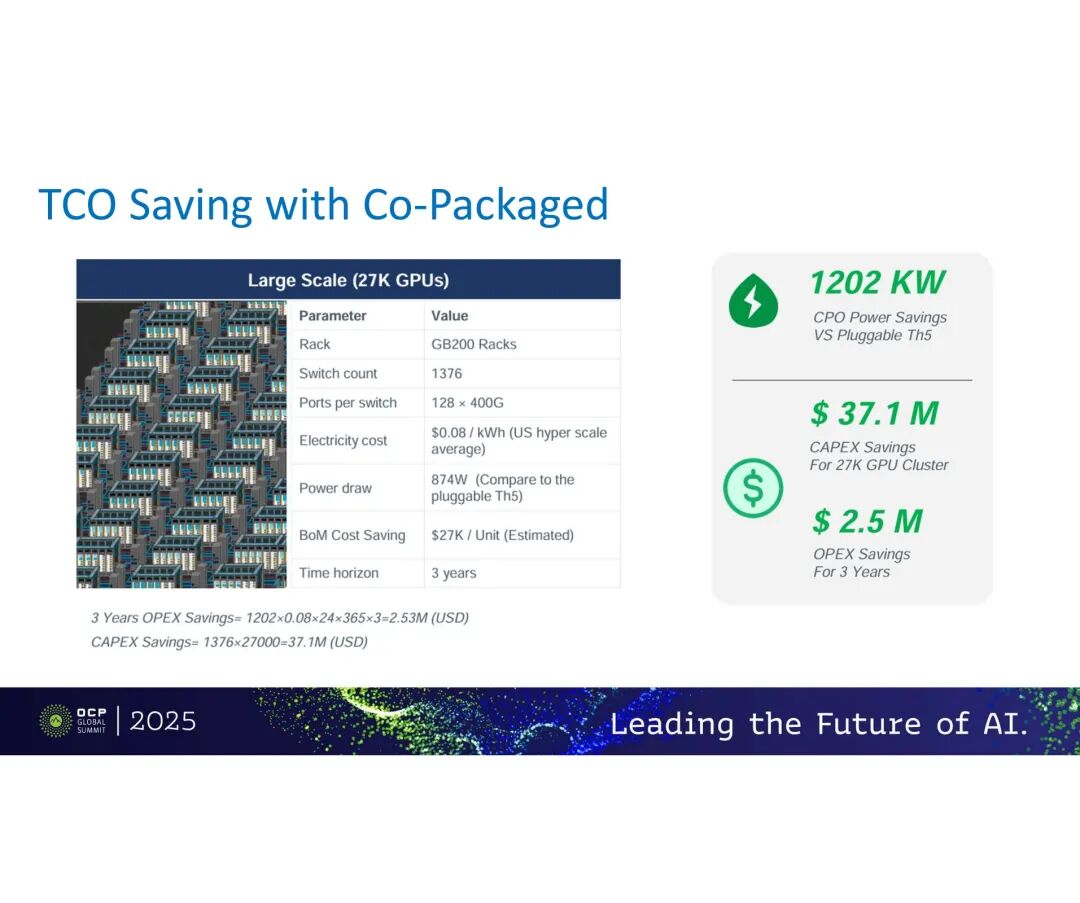 技术创新最终落地为显著的成本优势。以一个27000个GPU的大规模集群为例,采用Micas CPO交换机与Supermicro液冷方案,可实现可观的资本支出(CAPEX)与运营支出(OPEX)节省。