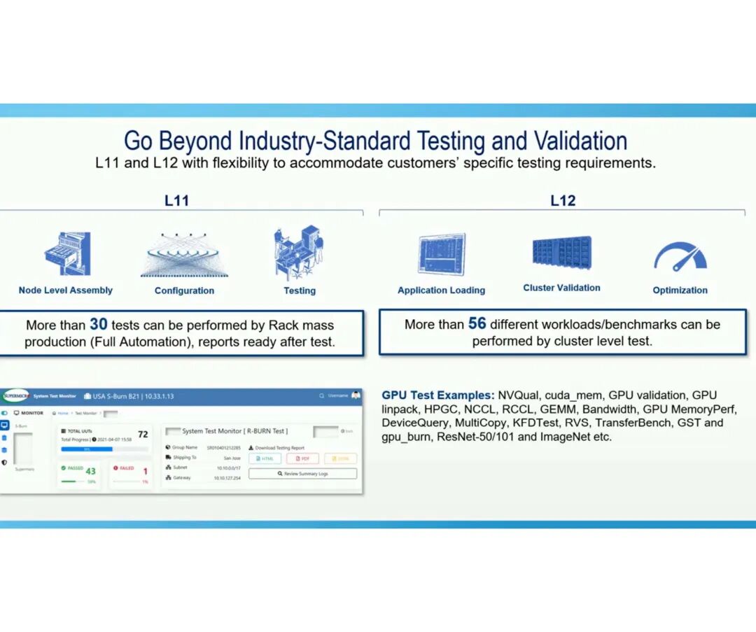 在测试环节,双方建立了L11节点级与L12集群级的双重测试标准。L11节点级测试通过全自动化量产测试流程,完成超过30项严格检测,包括配置验证、应用加载等,测试报告实时生成;L12集群级测试则覆盖56种以上工作负载与基准测试,涵盖NVQual、GPU验证、NCCL、ResNet-50/101等AI核心场景,确保系统在实际应用中的稳定性。