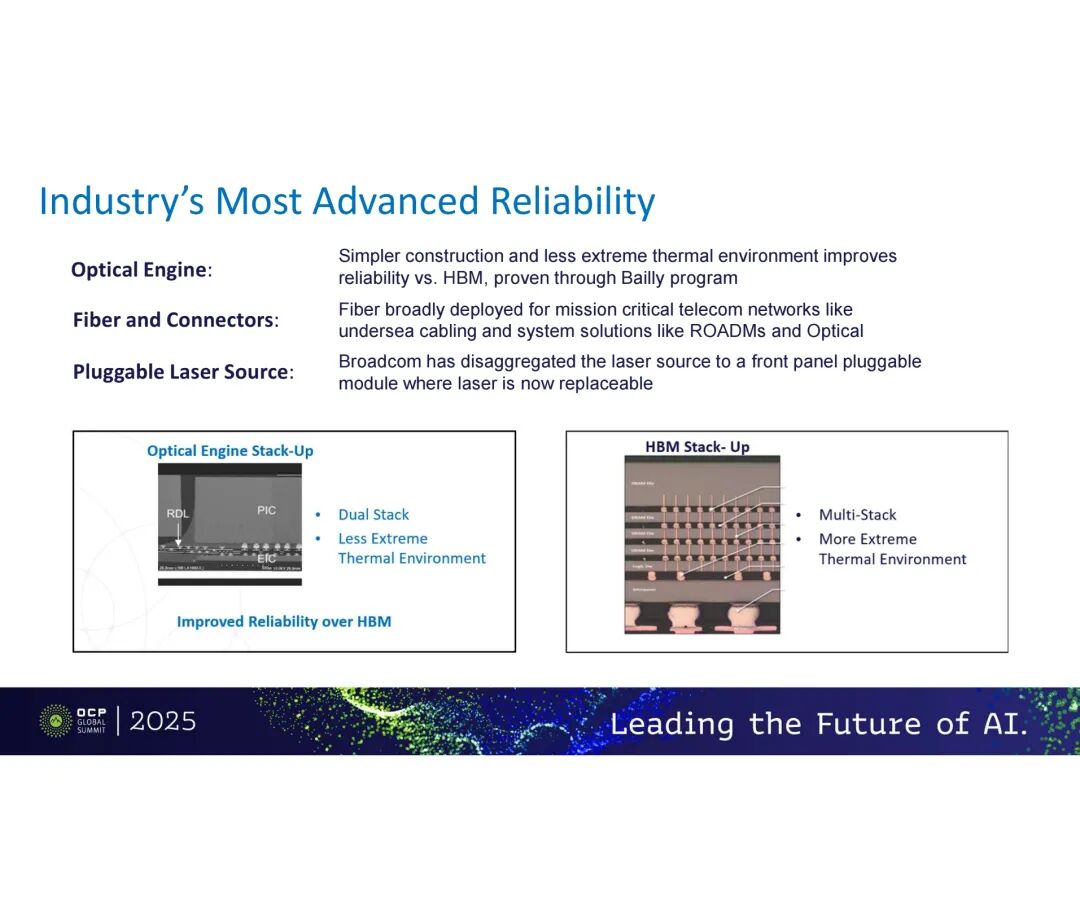 可靠性方面,CPO技术通过结构优化降低了故障风险:将激光源从ASIC芯片旁分离并前置为可插拔模块,既规避了核心部件的热干扰,又解决了传统设计中可维护性的顾虑。该激光源已通过供应商超5000万个单位的部署验证,生命周期可靠性得到充分保障;更有超大规模用户的实地测试证明,基于CPO技术的交换机系统运行超400万小时无单次端口波动,彻底打消了运维层面的担忧。