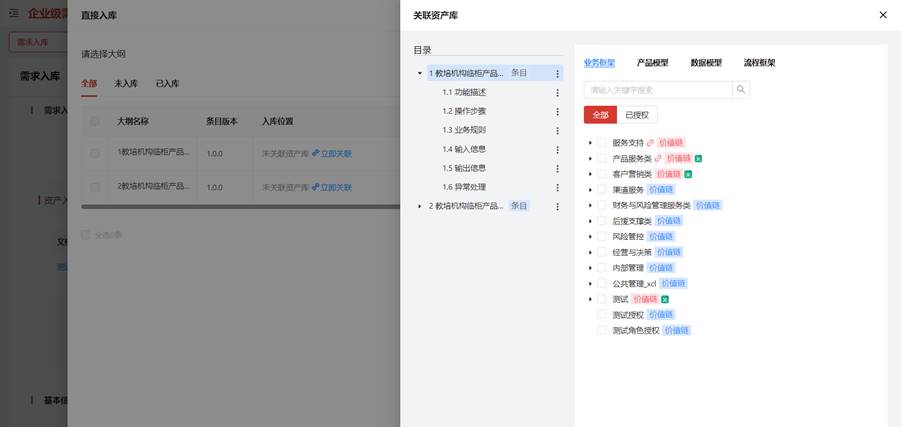 🏦 资产入库关联:将结构化条目与企业资产库中的资产结构位置进行关联(如按业务架构、应用架构、产品架构分类),完成入库操作。入库后的需求资产可纳入全文检索体系,支持后续快速查找与复用,据案例显示,需求复用率可提升 200% 以上。