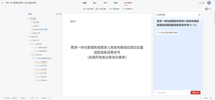 📌 用 AI 合并文档创建需求:当需求分散在多个碎片化文档中时,可通过 AI 合并功能将这些文档整合为统一的基线文档。AI 会智能识别文档间的逻辑关联,去除重复内容,确保合并后的文档结构清晰、内容连贯。