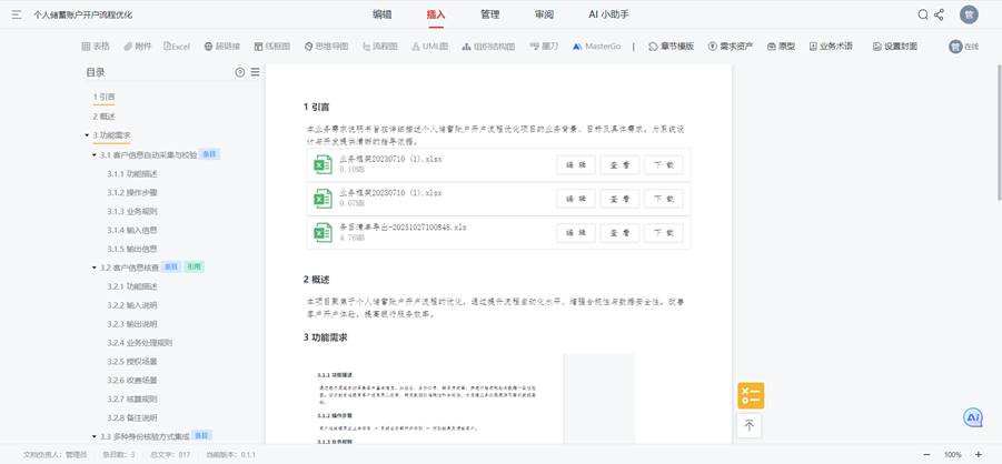 📎 多样化编辑辅助:支持导入外部文件(如 Excel 表格、流程图),直接插入需求文档;可灵活插入章节,调整文档结构;还能插入需求资产库中的条目,实现需求与已有资产的关联,增强需求的完整性与关联性。