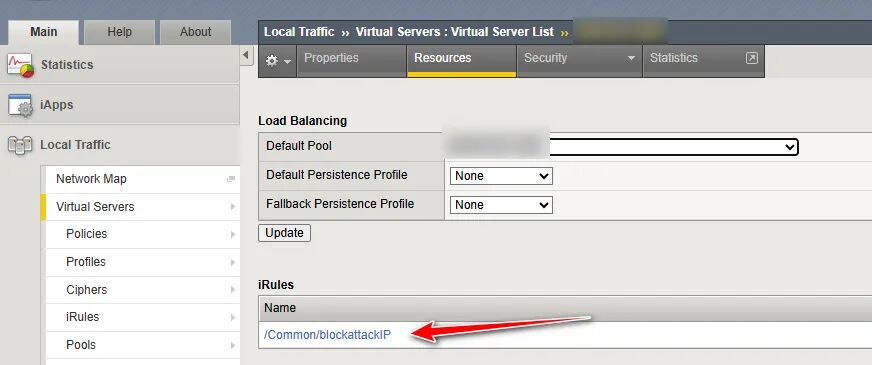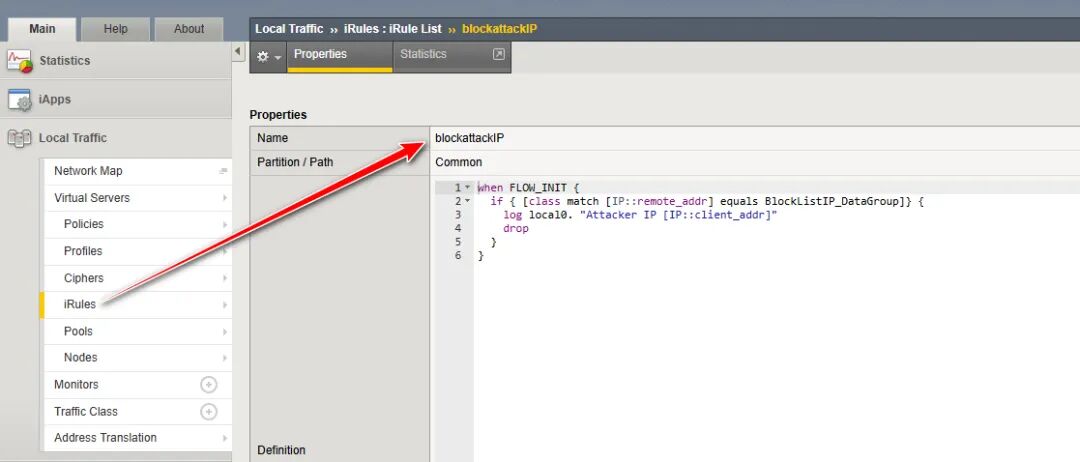 when FLOW_INIT { if { [class match [IP::remote_addr] equals BlockListIP_DataGroup]} { log local0. "Attacker IP [IP::client_addr]" drop } }