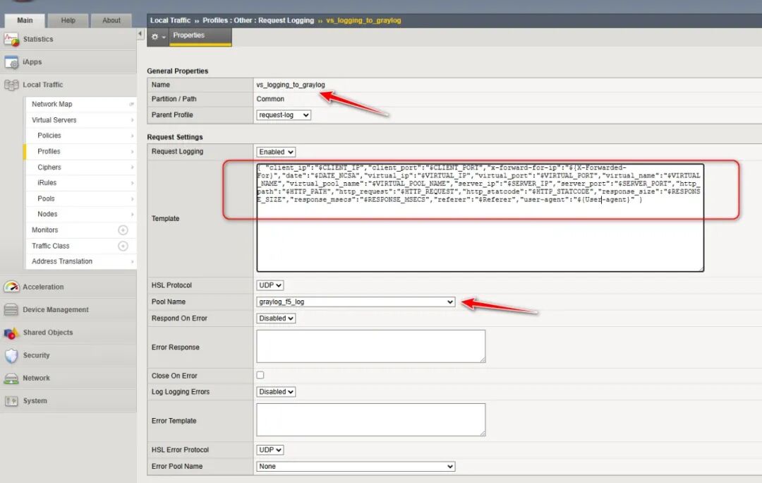 { "client_ip":"{X-Forwarded-For}","date":"VIRTUAL_IP","virtual_port":"VIRTUAL_NAME","virtual_pool_name":"SERVER_IP","server_port":"HTTP_PATH","http_request":"HTTP_STATCODE","response_size":"RESPONSE_MSECS","referer":"