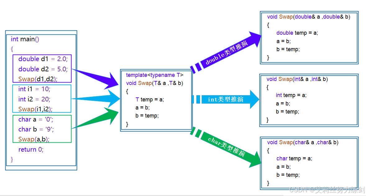 类型的函数以供调用。比如:当用double类型使用函数模板时,编译器通过对实参类型的推演,