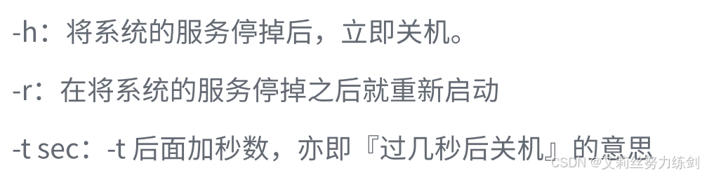 -h:立即重启; -r:重启; -t sec:+ [秒数]——n秒后关机。