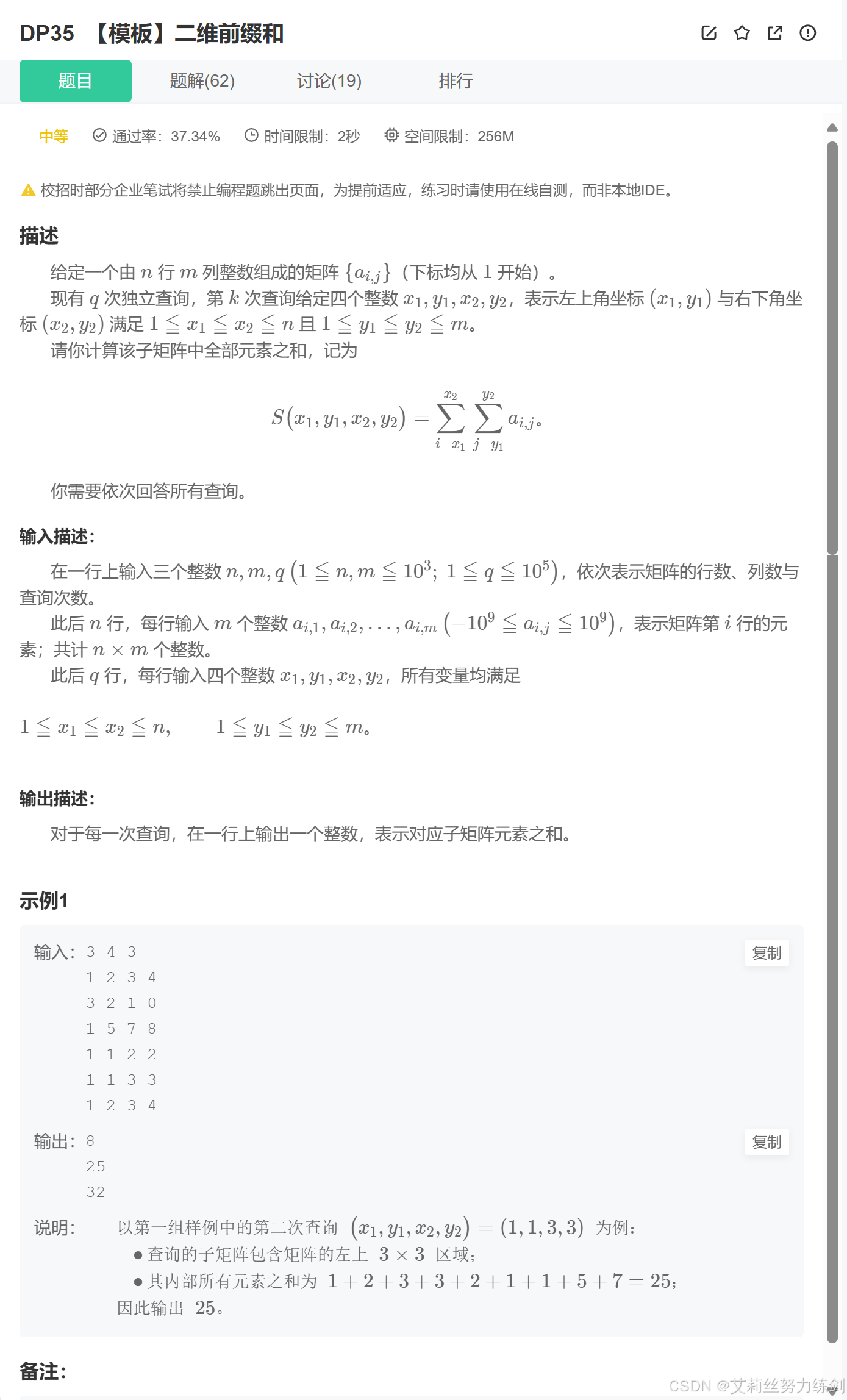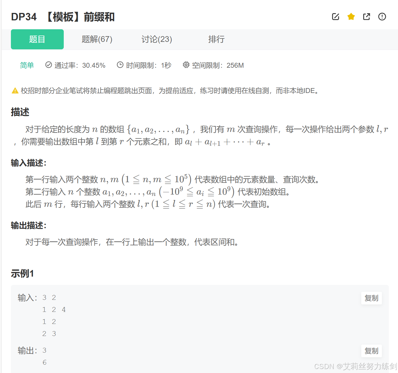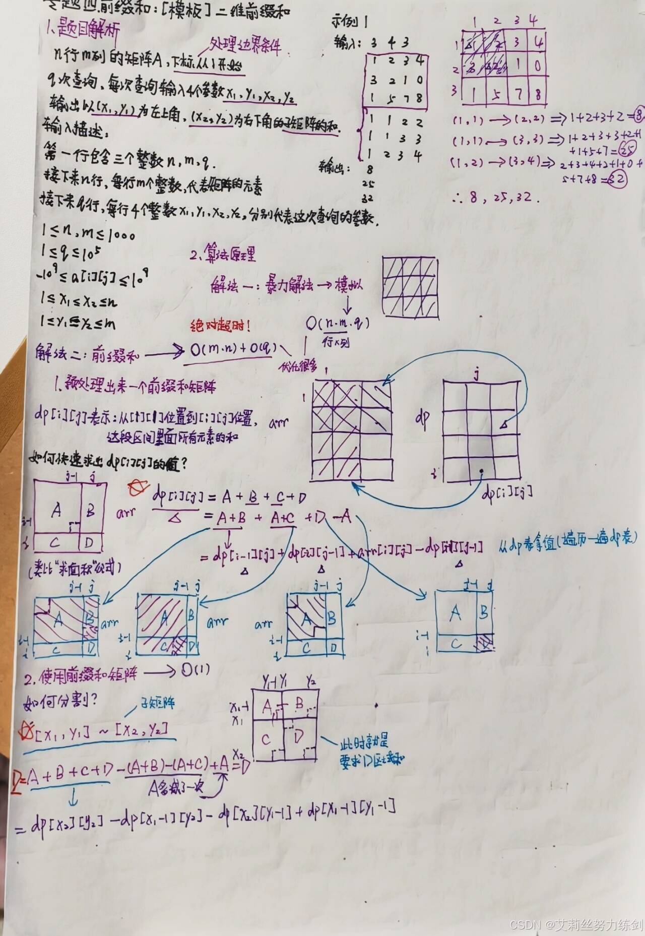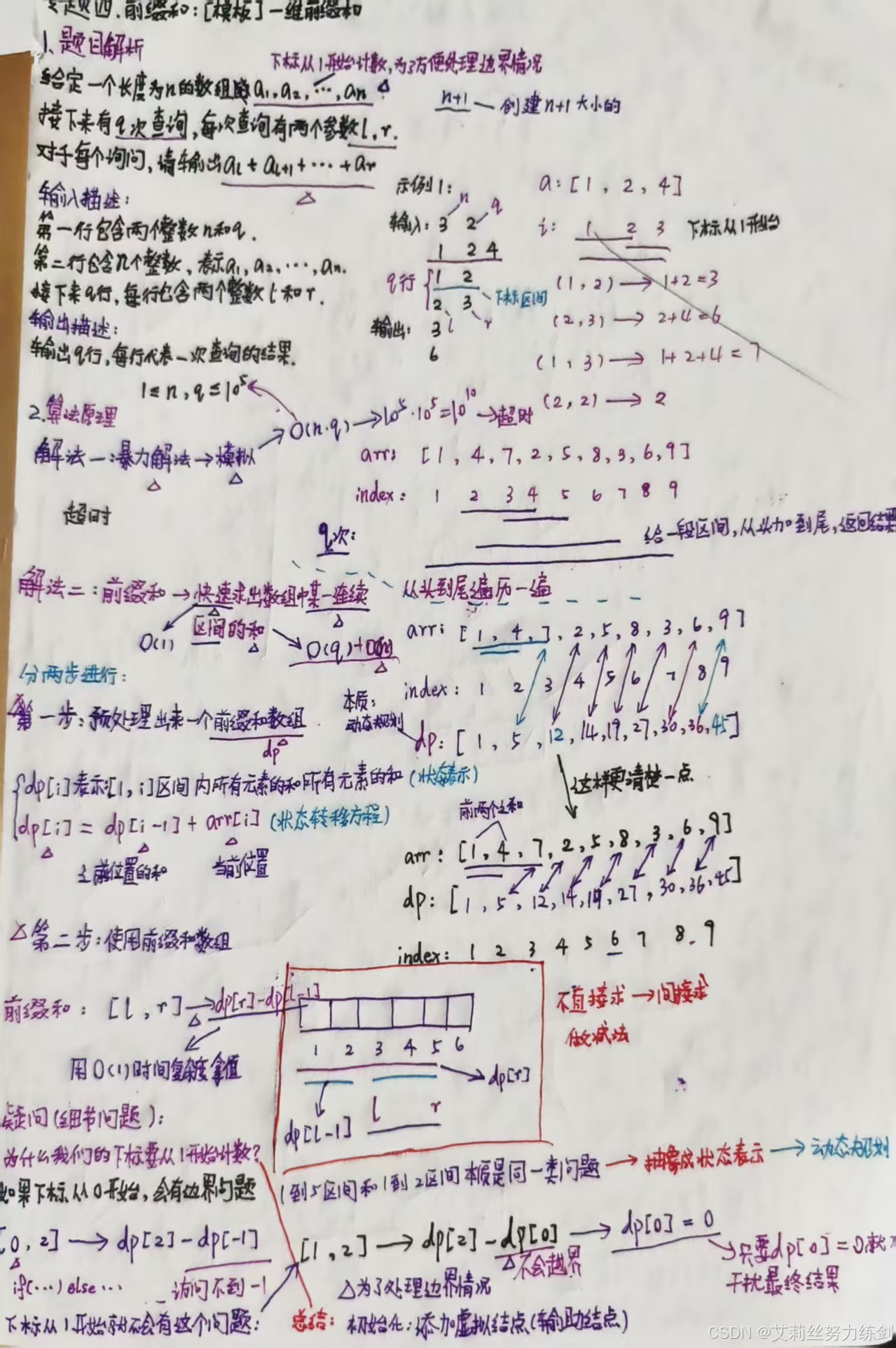 1、先预处理出来一个【前缀和】数组——用dp[ i ]表示。 [1 , i ]区间内所有元素的和,那么dp[i - 1]里面存的就是[1 , i - 1]区间内所有元素的和,那么——可得递推公式:dp[ i ] = dp[i-1] + arr[ i ]; 2、使用前缀和数组,【快速】求出【某一个区间内】所有元素的和: 当询问的区间是[ l , r ]时:区间内所有元素的和为:dp[ r ] - dp[l - 1]。