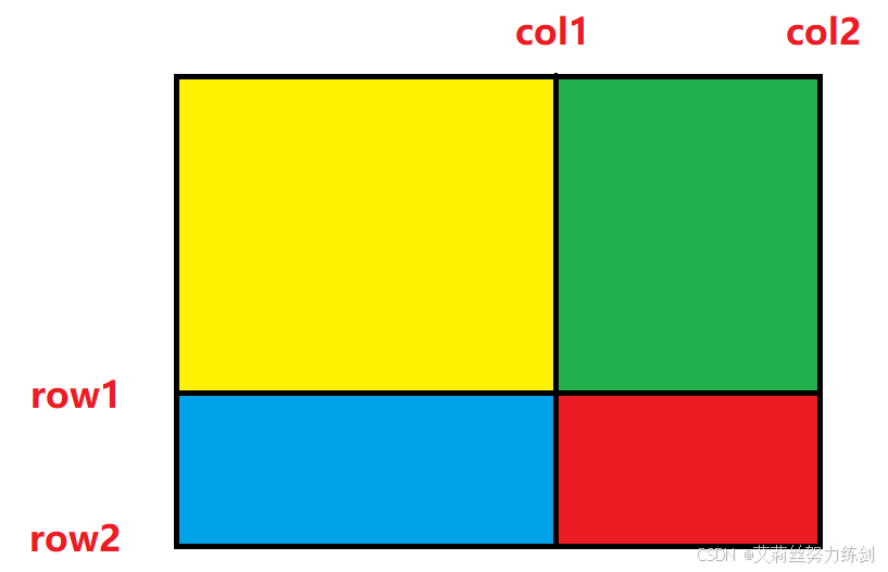 对于左上角(row1,col1)、右下角(row2,col2)围成的区域,正好是红色的部分。因此我们要求的就是红色部分的面积,继续分析几个区域: