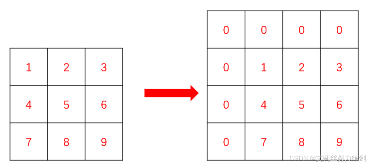 这里就要用到一维数组里面的拓展知识,我们要在矩阵的最上面和最左边添加上一行和一列0,这样我们就可以省去非常多的边界条件的处理(uu们可以自行尝试直接搞出来前缀和矩阵,边界条件的处理会让你崩溃的)。处理后的矩阵就像这样——