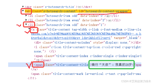 案例:百度首页(需要登陆百度账号)右侧的热搜,复制li标签下的a标签,复制好的selector为:#title-content,xpath为://*[aid="title-content"],同学们可以手动操作一下,手动复制的表达式是否唯一呢?