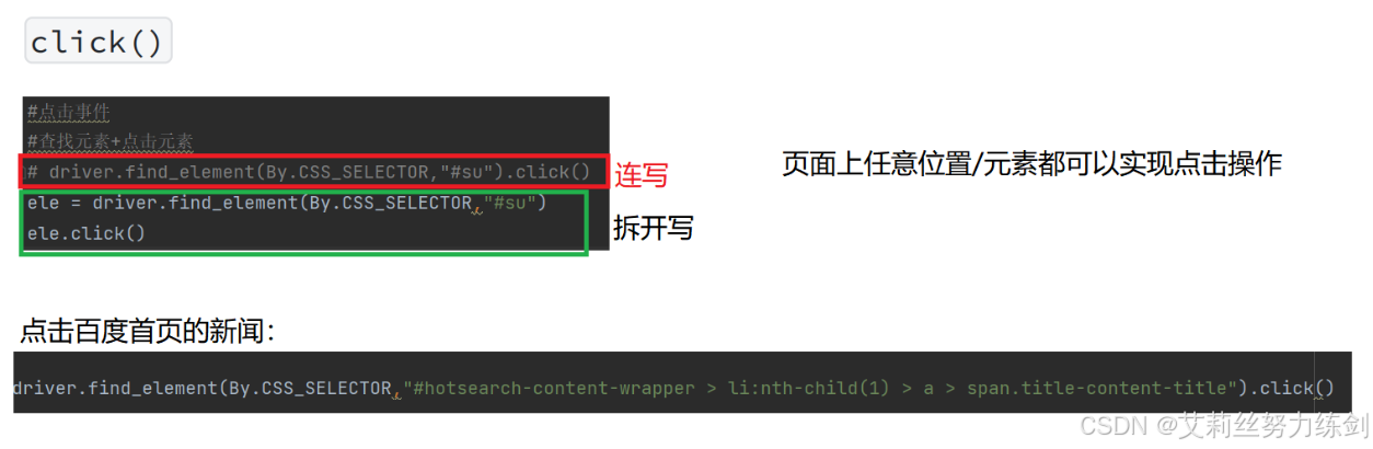 获取到了页面的元素之后,接下来就是要对元素进行操作了。常见的操作有点击、提交、输入、清除、获取文本。