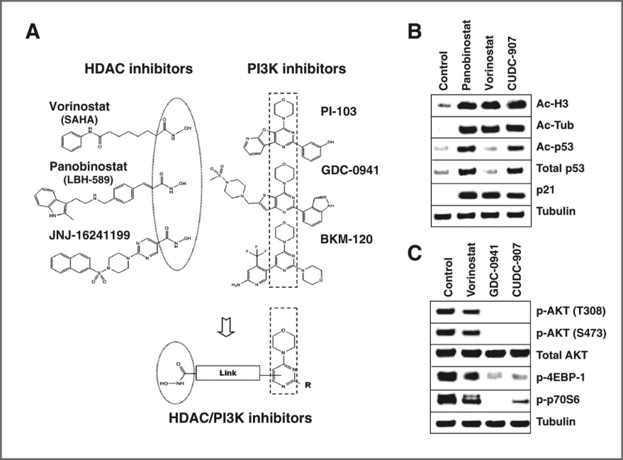 图 1. CUDC-907 design and its potency against PI3K and HDAC[1].