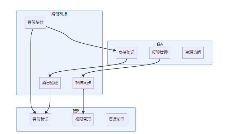 上图展示了多链访问控制的基本架构,包括不同链上的身份验证、权限管理和资源访问组件,以及连接这些组件的跨链桥接层。