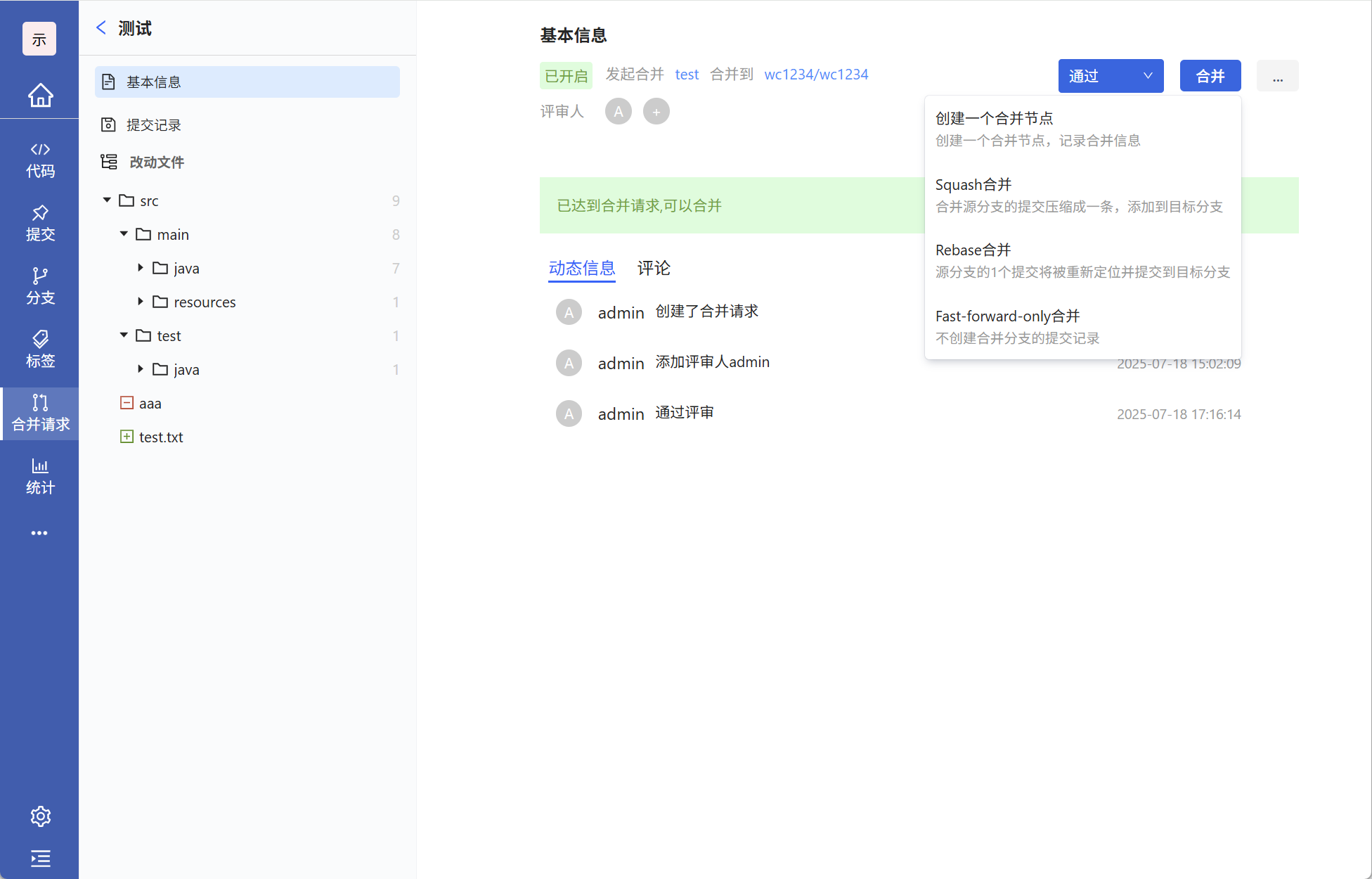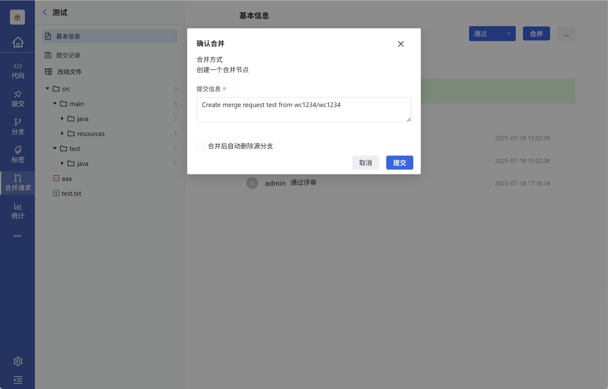 Rebase合并 | 变基合并,不创建新的合并请求,源分支提交逐一编辑到目标分支 |