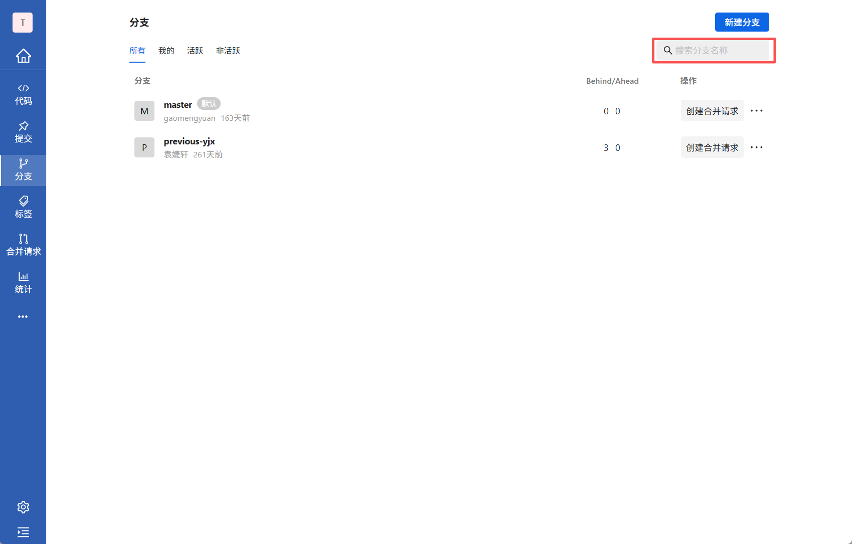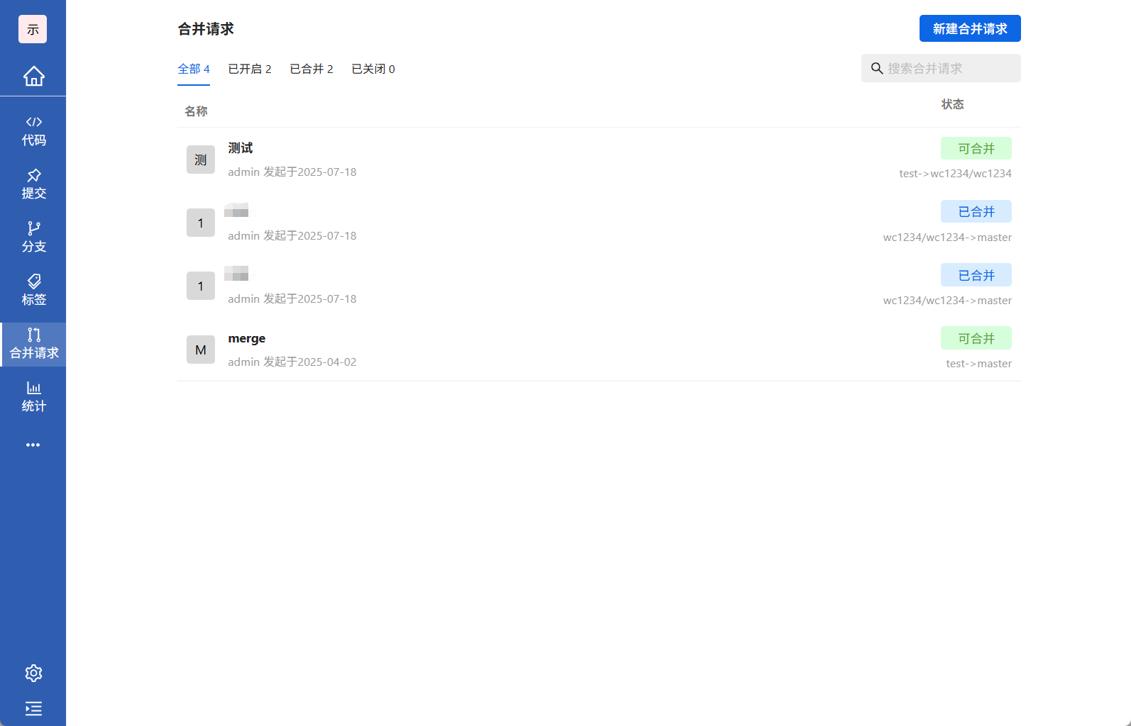 进入合并请求界面,点击新建合并请求按钮进入创建合并请求的界面