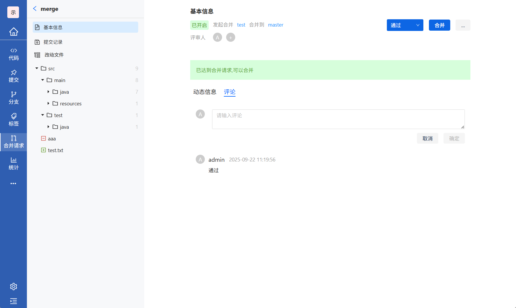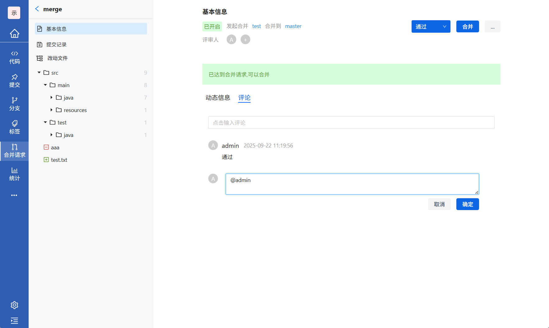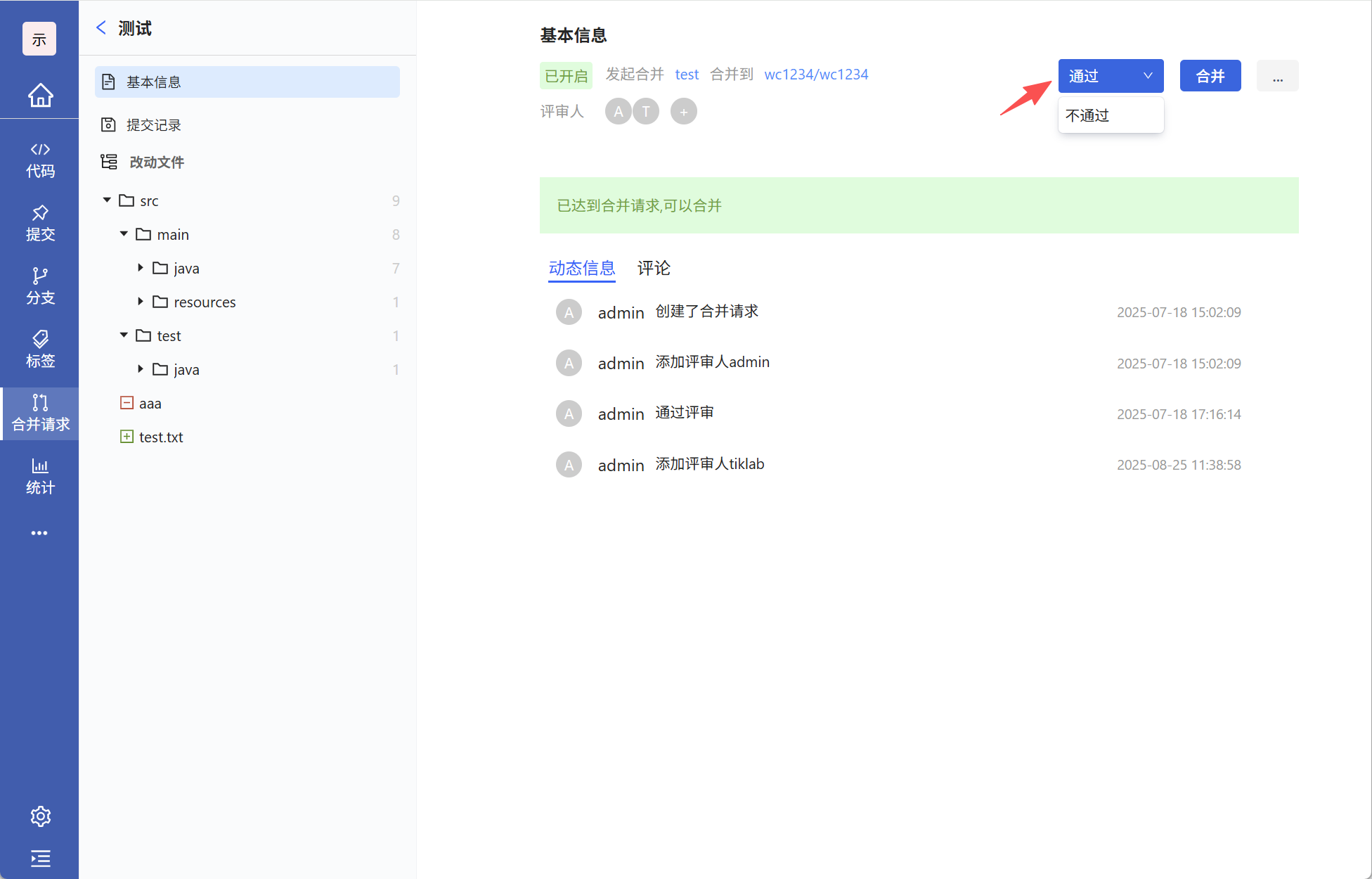 执行合并前需要满足两个条件:1. 源分支和目标分支没有冲突 ; 2. 审核通过(存在多个审核人时候,只需要一个审核通过即可执行合并)