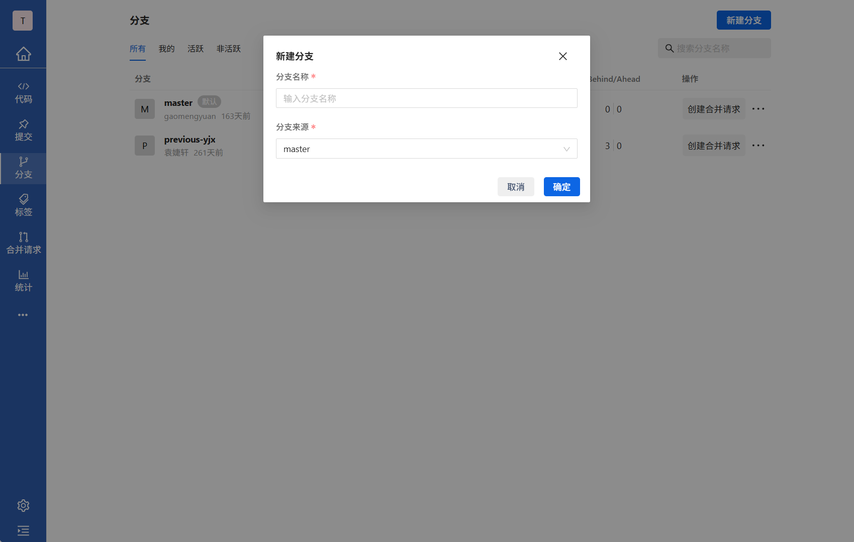 进入git仓库点击分支右上角的新建分支输入名称选择分支来源即可。