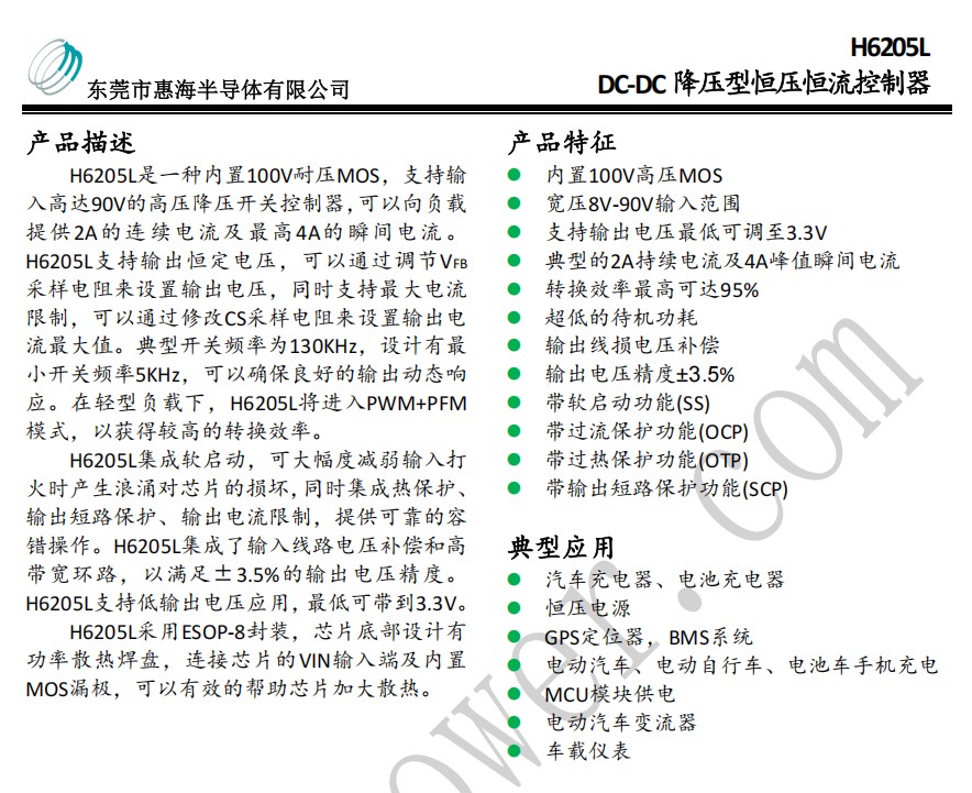 H6205L 是一款内置 100V 耐压 MOS 的高压降压开关控制器,支持最高 90V 输入电压,可提供 2A 连续电流与 4A 瞬间峰值电流,尤其适配无人机的高压供电系统 —— 能稳定为无人机的电机驱动模块、飞控系统等核心部件供电,满足其瞬间大电流需求。