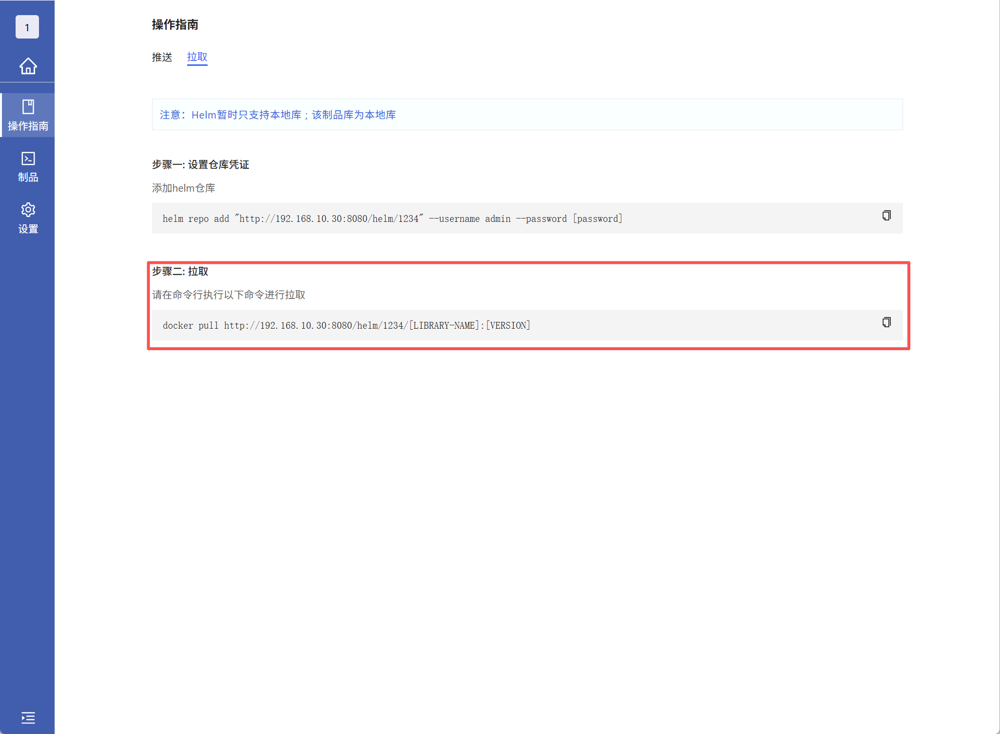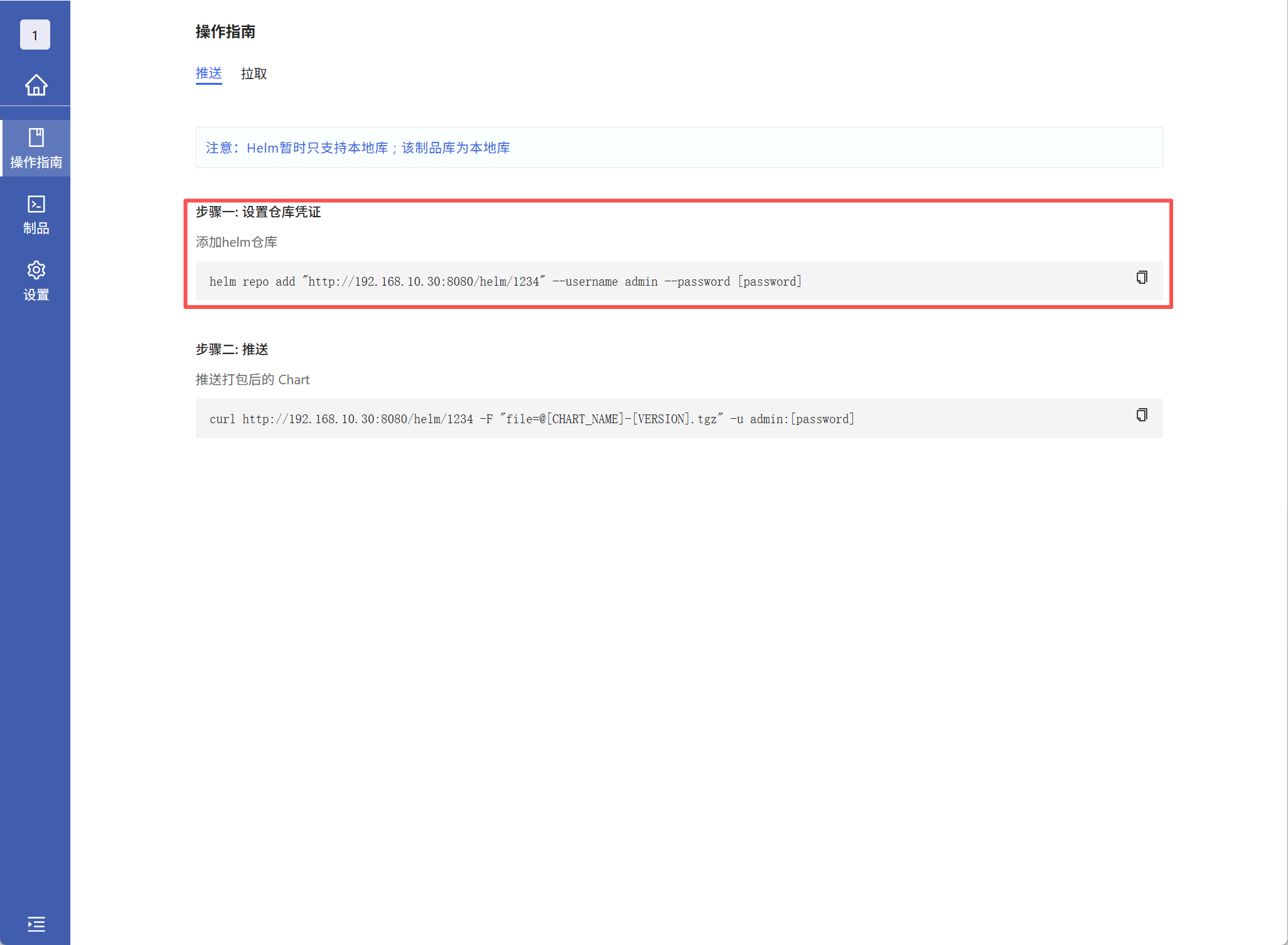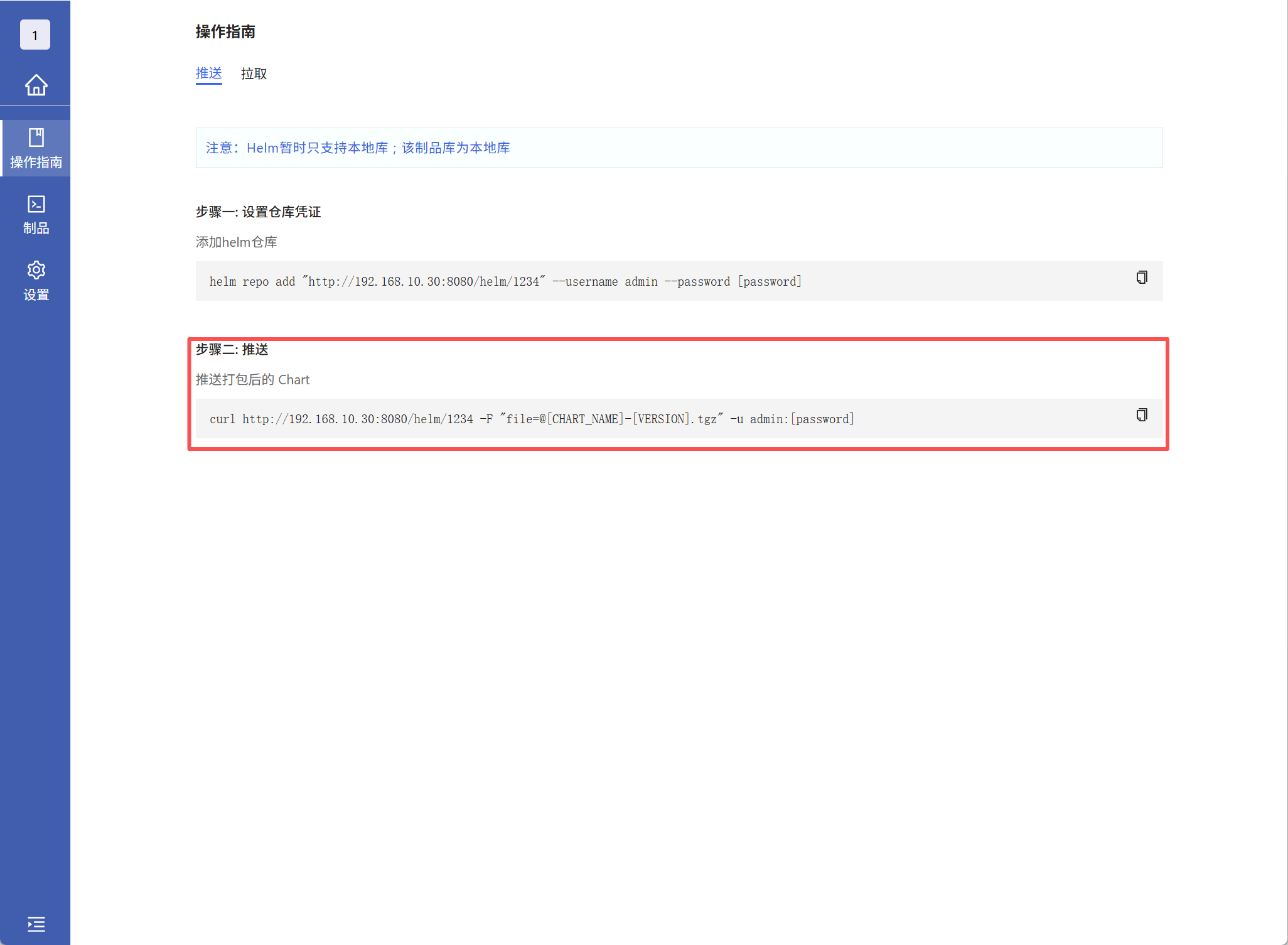 进入制品库界面点击右上角操作指引选择Helm进入操作指引界面。替换对应的文本即可