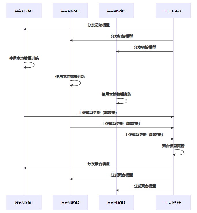 联邦学习允许多个具身AI设备在不共享原始数据的情况下协同训练模型: