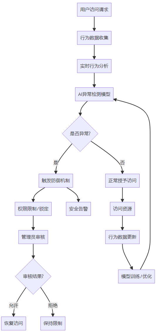 上图展示了AI驱动的访问控制异常检测系统的基本流程。当用户发起访问请求时,系统收集相关行为数据,通过AI模型进行实时分析,判断是否存在异常。如果检测到异常,系统会触发相应的防御机制;如果正常,则授予访问权限。同时,系统会持续更新行为数据,用于模型的训练和优化,形成闭环学习。