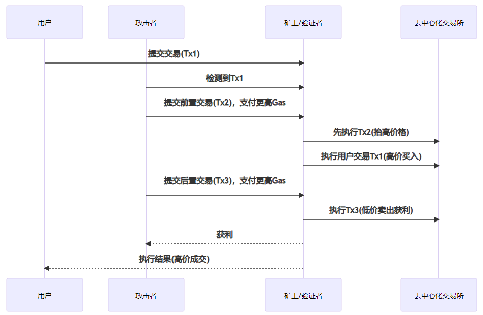 MEV(Maximum Extractable Value)是矿工或验证者从区块链交易顺序中提取的价值。主要攻击形式包括: