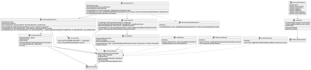 Apache Pulsar的NamespaceBundle管理机制是其分布式架构的核心组件,通过NamespaceBundleFactory管理NamespaceName到NamespaceBundle的映射关系,支持动态分裂和合并操作。每个NamespaceBundle代表一个命名空间的分片,通过NamespaceBundles进行组织管理,而NamespaceService作为核心服务协调NamespaceBundleFactory和OwnershipCache来处理Bundle的获取、分裂和所有权管理。OwnershipCache利用分布式锁机制通过LockManager和ResourceLock确保同一时间只有一个Broker拥有特定Bundle的所有权,通过OwnedBundle管理Bundle的激活状态和卸载请求。负载均衡功能由LoadManager和ModularLoadManager实现,结合BundleSplitStrategy监控BundleData和NamespaceBundleStats中的负载指标,当检测到热点Bundle时触发自动分裂流程。整个机制通过ServiceUnitUtils提供工具方法,使用元数据存储系统维护Bundle的持久化状态,确保集群中Bundle分布的均衡性和一致性,同时NamespaceBundleSplitAlgorithm提供不同的分裂算法支持灵活的Bundle分割策略。