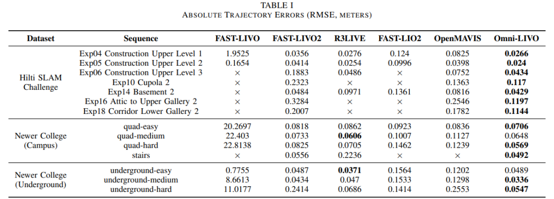 表 I 总结了所有序列的绝对轨迹误差(RMSE)。Omni-LIVO 在 14 条序列中有 11 条达到最低误差,并成功完成全部轨迹,表现出优异的精度和鲁棒性。