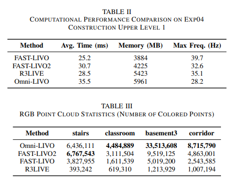 表 III 显示 RGB 点云生成能力,Omni-LIVO 在各序列中稳定产生比其他方法多 2–4 倍的彩色点,在复杂环境如 basement3 中,RGB 点数比 FAST-LIVO2 多 3.5 倍,多相机配置确保即使在挑战场景下也能实现完整颜色覆盖。