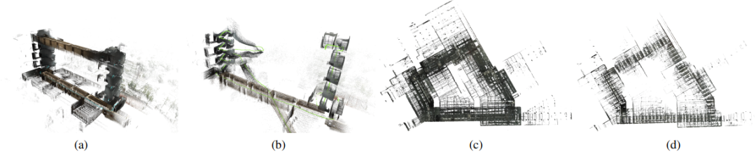 图 8. 地图质量对比(a) Omni-LIVO 多楼层重建,四相机覆盖实现稠密颜色化;(b) R3LIVE 单相机结果,颜色点稀疏且覆盖不完整;(c) Omni-LIVO 地下场景重建,即使光照变化大,也保持多相机稠密颜色化;(d) FAST-LIVO 地下场景结果,重建质量下降且存在明显空洞。