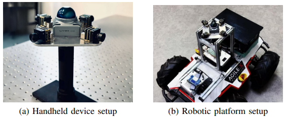 自定义数据集:使用 LIVOX MID360 激光雷达(360° FoV,10Hz)和四台相机(1024×768,10Hz)组成交叉阵列,采集平台包括手持设备和机器人安装平台(如图 6 所示)。