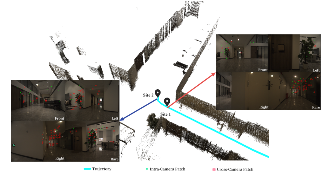 图 4. 转弯过程中光度块迁移示意图。中央的激光雷达地图显示了机器人轨迹,并标注了两个关键位置。* 位置 1:同一相机内的光度块(绿色)在相机视场内保持连续跟踪。* 位置 2:相同的光度块跨相机迁移,形成跨视角关联(红色)。该机制在转弯运动过程中有效保持了多相机阵列间的光度连续性