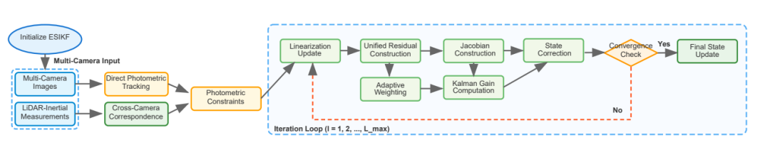 图 5. 迭代多相机 ESIKF 框架示意图。该框架在标准 ESIKF 基础上扩展了多视角融合能力,主要包括:1. 迭代线性化:处理来自多相机的非线性光度残差;2. 联合残差堆叠:将激光雷达几何约束与多相机光度约束组合在同一观测向量中;3. 自适应协方差加权:根据各相机跟踪质量动态调整测量可靠性;4. 状态增量更新:通过卡尔曼滤波迭代更新状态,直至收敛。该多模态方法相比单一传感器估计,显著增强了可观测性与鲁棒性。