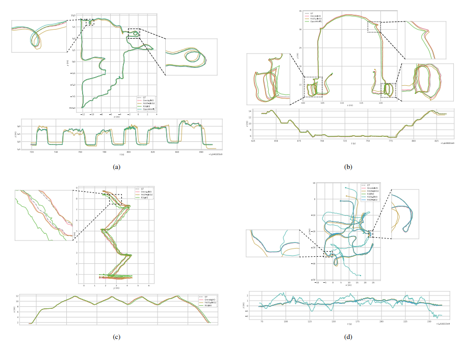 图 7. 挑战序列的轨迹对比(a) Exp06:快速旋转导致单相机跟踪失败,而 Omni-LIVO 通过跨视角时域迁移保持轨迹一致性;(b) Exp16:多层环境及垂直移动,多相机阵列在激烈的 3D 运动中保持连续性;(c) Stairs:复杂螺旋运动,LiDAR-视觉融合增强了可观测性;(d) Underground-hard:极端光照变化环境下,Omni-LIVO 通过自适应协方差加权保持鲁棒性,而其他方法出现漂移或失败。