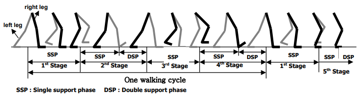 假设该人形机器人在平坦地面上行走,因此所有接触点及零力矩点(ZMP)在 z 轴方向的分量均为零: