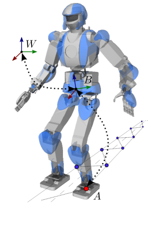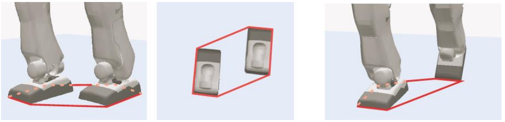 因此,ZMP实际上是接触点的一个凸组合(convex combination)。这意味着——当所有接触力都是单向(只向上)时,ZMP必定位于接触面的凸包内。而这个凸包的二维投影区域,被称为 支撑多边形(Support Polygon)。只要ZMP保持在支撑多边形内部,机器人就能保持稳定;一旦ZMP越界,机器人便会倾倒。