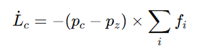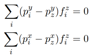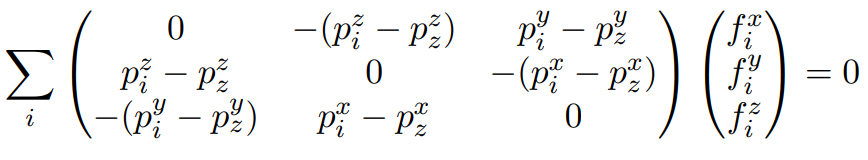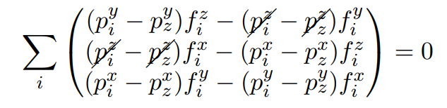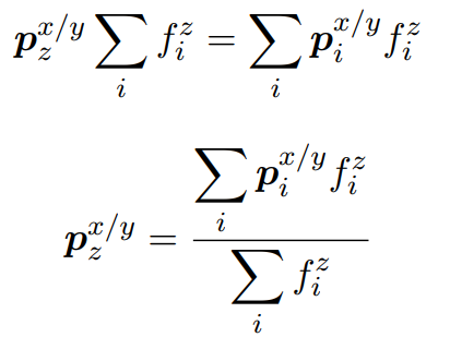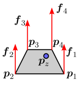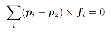 想象一个机器人脚掌上有多个受力点 p_i,每个点受到地面反作用力 f_i。这些力会对机器人身体产生一系列的转动力矩。如果我们能找到一个点 p_z,使得所有这些力矩在该点处相互抵消、合为零,那么这个点就是 ZMP。