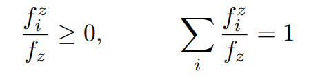 也就是说,平坦地面上的零力矩点(ZMP)位置是所有接触点位置 pi的加权平均值(weighted sum),加权系数是各接触点的竖直支撑力。由于地面对脚底的支持力始终向上(fzi≥0)有: