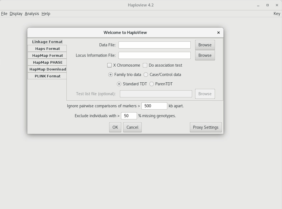 选择第一种格式:Linkage Format,然后将ped数据导入到Data File中,将info数据导入到Locus Information File文件中。