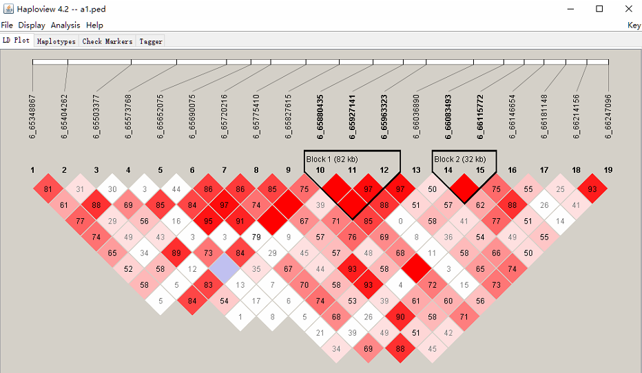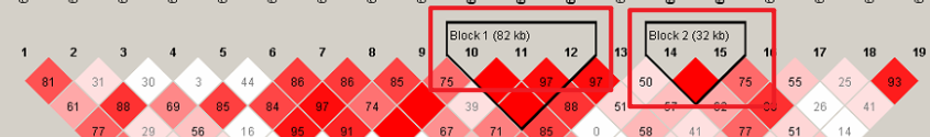 最下面红白的正方形是LD值的可视化,每一个正方形是两两SNP的LD结果,颜色越淡说明LD值越小,如果相邻的SNP之间的LD大于某个阈值(比如0.9),那么就构成一个block,下图中的两个红框里面的黑框,就是两个LDblock,第一个block包括的SNP有10,11,12三个SNP,block的距离为82kb,第二个block包括两个snp,包括14和15两个snp,block的距离为32kb。