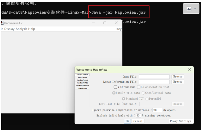 注意,有时候会有问题,windows系统安装Haploview总是错误,解决方案是直接用jar文件,在终端cmd中运行: