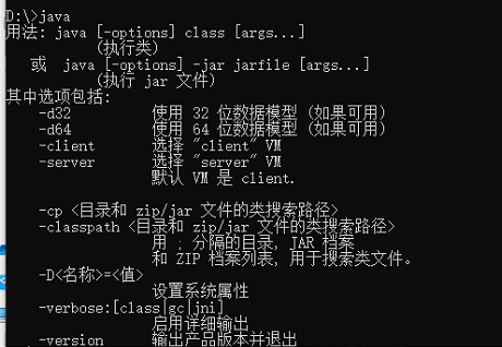 cmd终端打开,键入java,出现下面界面,说明配置成功。