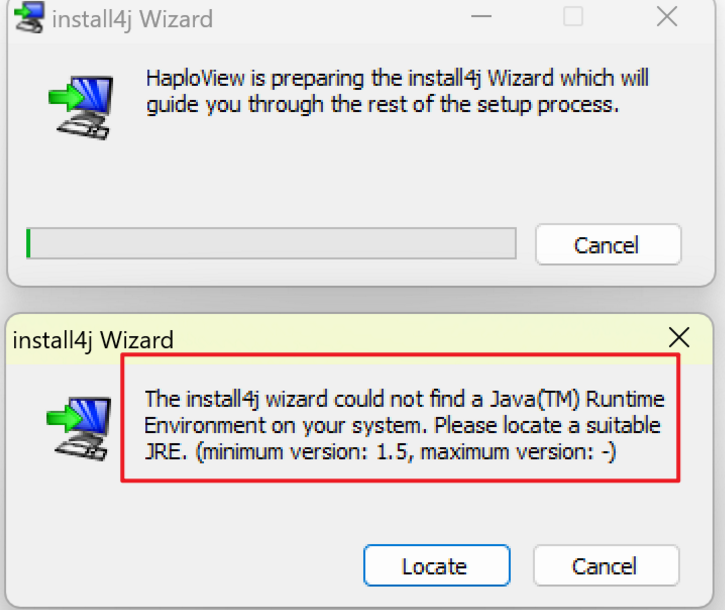 注意:有些windows电脑(大部分)会报错,可以用简单的方法,在终端直接执行,不用安装上面的exe安装包,方法如下:(Haploview软件windows安装失败:No JVM could be found on your system)