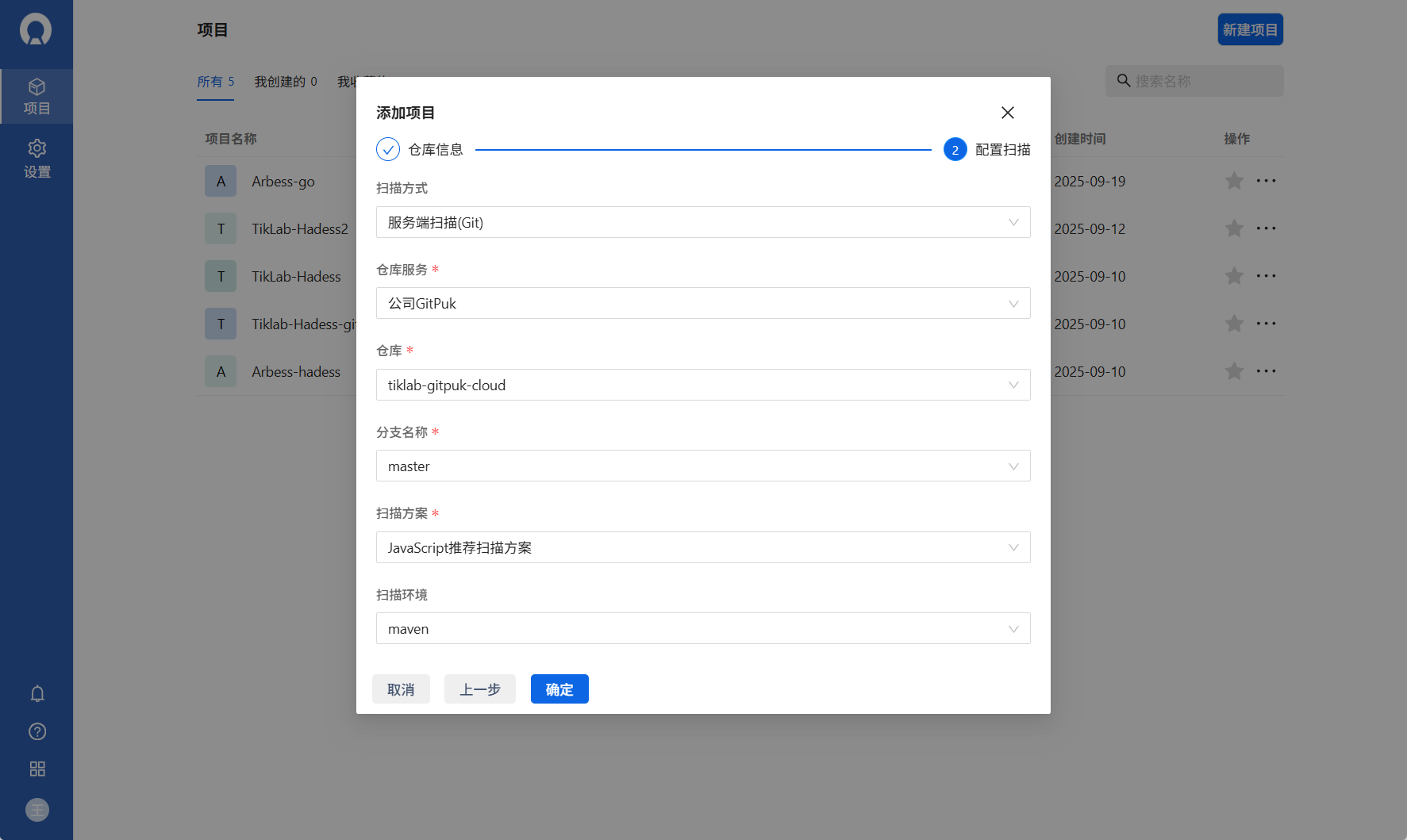1,在SourceFare集成GitPuk绑定后,创建GitPuk要扫描的该仓库