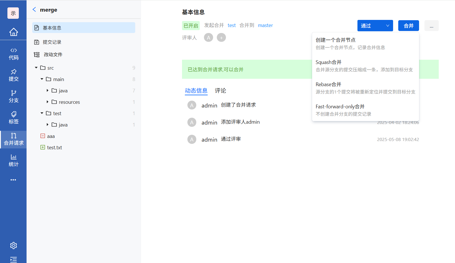 2.人工评审通过后即可点击通过,GitPuk同时支持四种合并方式