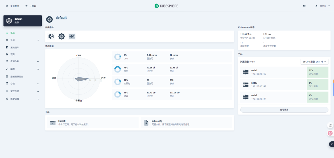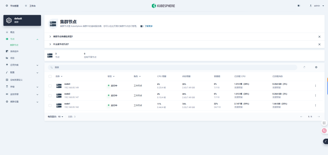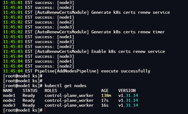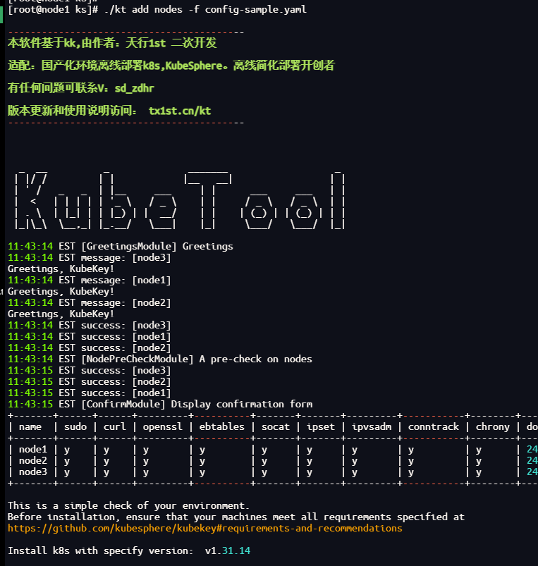 ./kt init-os -f config-sample.yaml./kt add nodes -f config-sample.yaml本文由于资源有限,用了三个节点全部作为控制节点和工作节点,如果只添加工作节点,只是配置文件中略有不同,命令还是一样的。