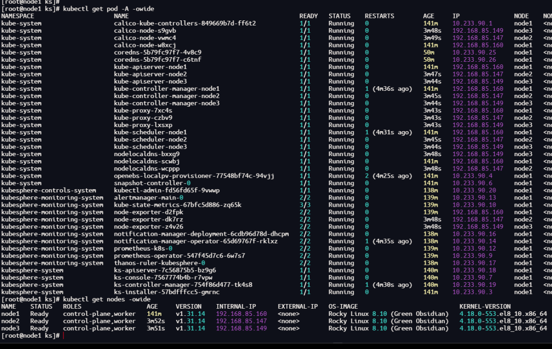 上一篇文章中使用k8s 1.31.14+ks3.4.1部署了all-in-one,本文将演示在all-in-one基础上由1个节点扩展为3个master节点。